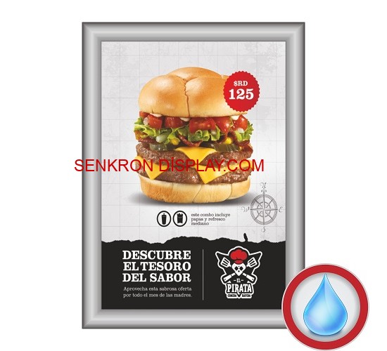 Kilitli Su Geçirmez Afiş Çerçevesi, seçtiğiniz grafiğin sergilenmesi için profesyonel bir çözümdür. Kilitli ve su geçirmez mekanik sistemin yanı sıra, çerçeve dizaynı kaliteli ve dikkat çekici estetiğe sahiptir. Kullanılan materyal ve şekli dolayısıyla her türlü ortama uyum sağlar. Görselleriniz özel koruma filmi sayesinde ışığa bağlı parlama yapmaz ve solmaz.